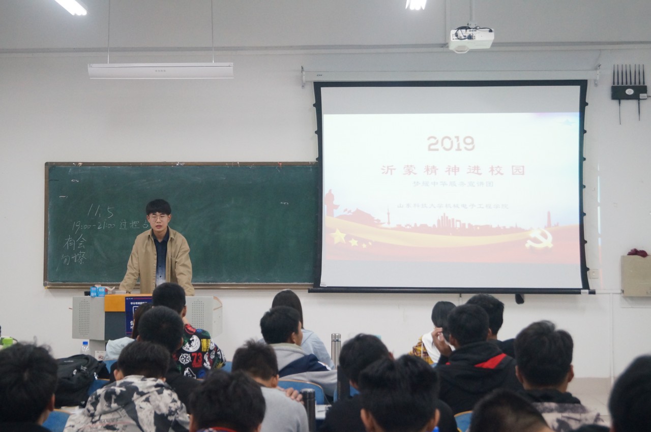 点击:11月3日-11月8日,在新中国成立70周年之际,为加强爱国主义教育,大力弘扬“沂蒙精神”,机电学院开展了“沂蒙精神进校园”红色文化宣讲活动。此次宣讲活动由梦耀中华服务宣讲团主讲,机电学院2019级5个专业共530余名同学参与。