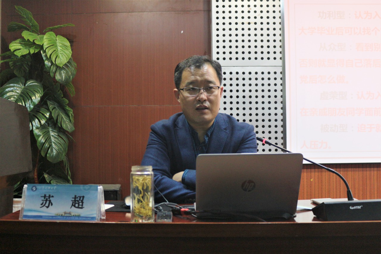 苏超从《中国共产党章程》中对党员的要求谈起,向参训学院阐释了入党标准和入党条件,强调大学生党员在学生群体中要起到先锋带头作用,坚持正确的政治方向,提高自身政治素养,维护国家、社会和学校的稳定。苏超与参训学院一同重温了南京航空航天大学马克思主义学院党总支书记徐川撰写的《我为什么加入中国共产党》,强调作为入党积极分子要端正入党动机,全心全意为人民服务,为共产主义和中国特色社会主义事业奋斗终生。苏超指出,入党既是一份光荣,也是一份职责和挑战,希望全体学员秉承自己的入党初心,牢记使命,争取早日加入中国共产党。