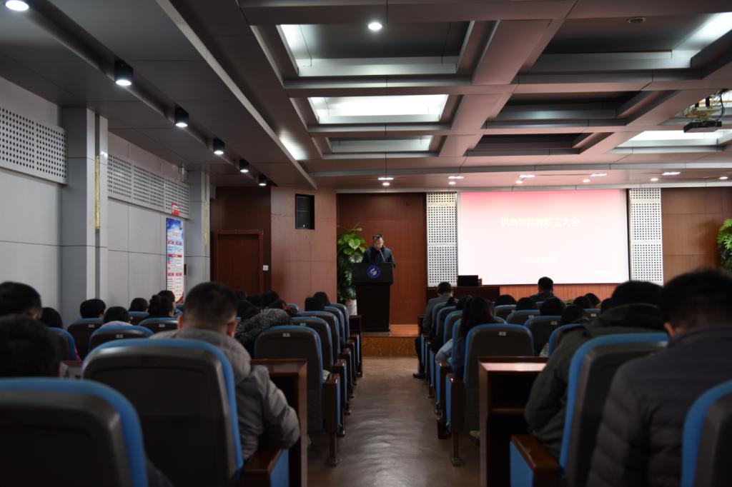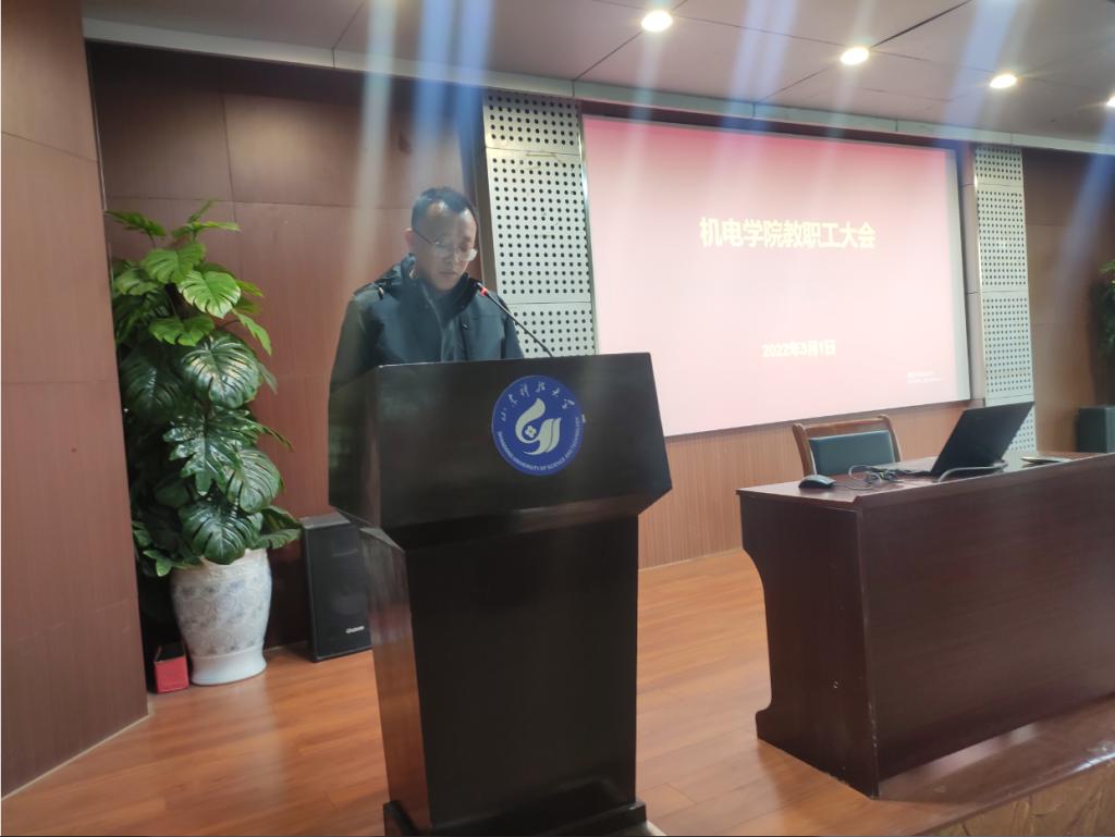 李双立首先强调了安全工作要做到“六防”:即防疫、防火、防盗、防水、防交通事故、防网络舆情。接着肯定了学院工作的成绩,指出了学院目前存在的主要问题:一是管理工作科学化、规范化不够,协调不到位,干部队伍执行力不强。二是学院凝聚力不强,干事创业的生态环境有待加强和改善。三是学科专业新增长点不多,研究方向凝练不够,教师梯队出现断层,年轻教师成长不够快。四是经济比较困难,产教融合、科教融合不够,没有充分利用校内校外资源。最后李书记提出改进措施和要求:一是以“严真细实快”的工作作风,加强班子队伍、机关作风建设。二是为师生办实事,改善教师教学、科研、实验条件。三是学院工作公开透明,多商量、多沟通,营造和谐和干事创业氛围。四是坚持开放办学,充分利用校内校外资源,推动学院发展。五是开源节流,创造更大效益。他相信,在学院师生员工的共同努力下,机电学院的明天一定更加美好。