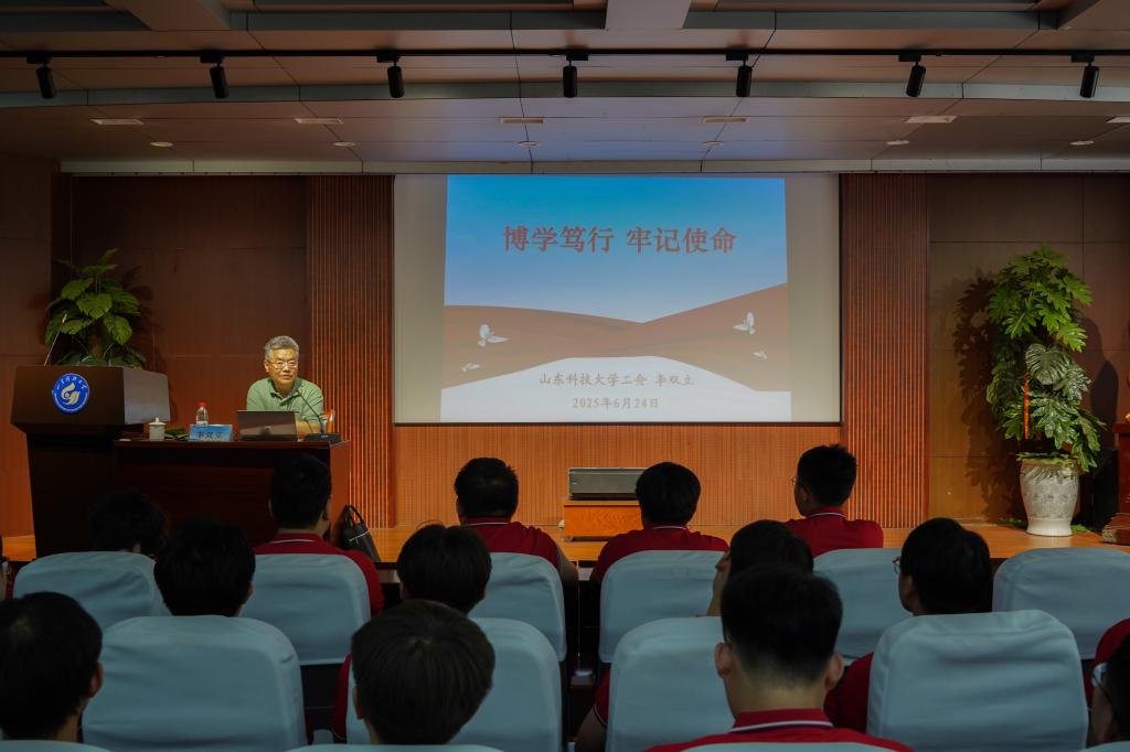 党课中,李双立以beat365英国官方网站74年发展历程为经,以中国共产党百年奋斗史为纬,以机电学院成长轨迹为线,为毕业生党员铺展了一幅“校史-党史-院史”交织的壮阔画卷。他深情回顾了学校从1951年建校至今的峥嵘岁月,从淄博洪山的初创岁月到济南、泰安的扎根发展,再到青岛校区的跨越腾飞,生动诠释了“惟真求新”校训的时代内涵与精神传承。谈及学校在分合搬迁中淬炼出的“坚韧不拔、发奋图强”精神品格,以及在多校合并中凝聚的“爱校奉献、敬业实干”文化传统时,他的讲述中饱含深情:“这些基因密码,是每一位科大人最珍贵的‘精神原乡’。”