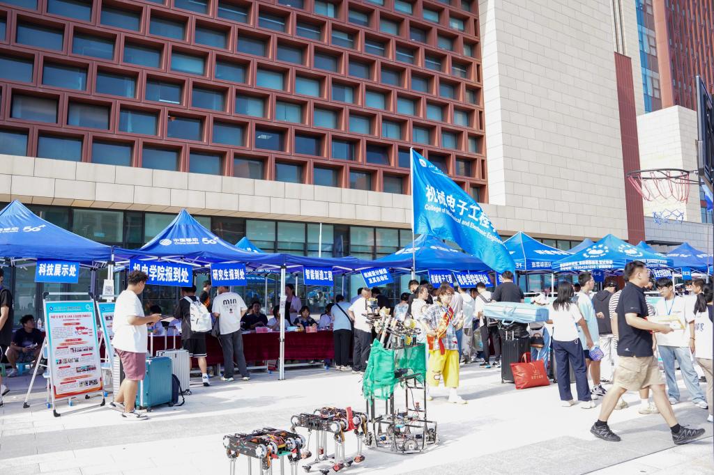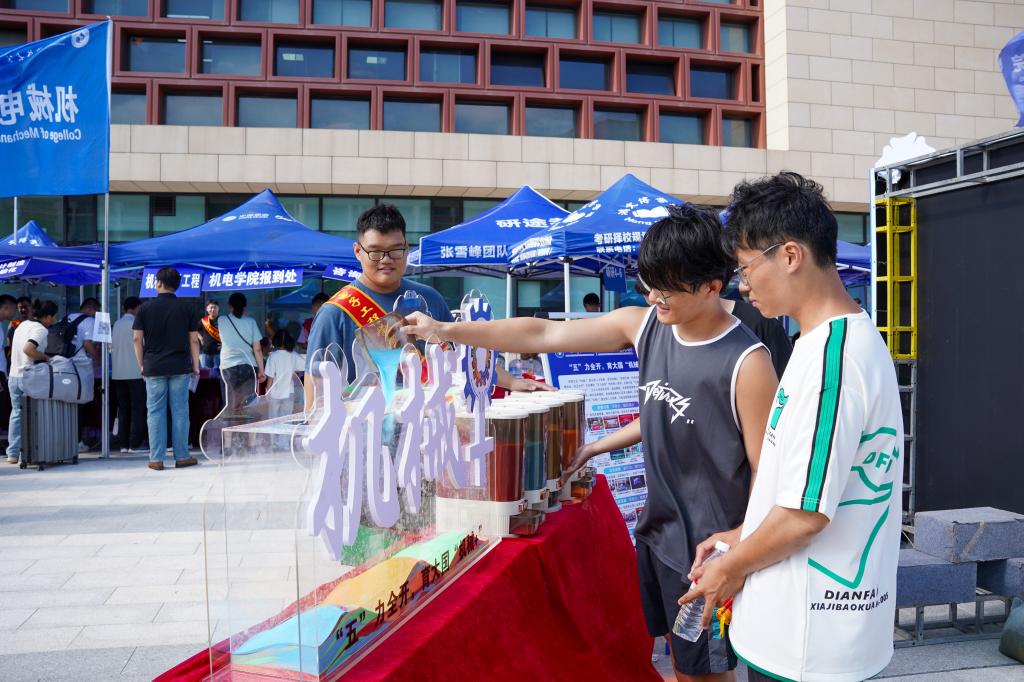 学院迎新点以“‘五’力全开,育大国‘机械+’”为主题,特别设置“五”力赋能仪式,五种颜色的彩砂分别对应“引领力、源动力、躬行力、灵动力、融合力”(学院“五维育人”核心能力),新生在志愿者引导下将彩砂倾倒入“机械+”能量仓内,寓意“五力”从此刻起融入成长血脉。此外,学院迎新点的科技展示处的机器人更是吸引了众多新生的目光,小平科技创新团队成员们为他们细心讲解,每一部投篮机器人、仿生足式机器人的背后都凝结着机电学子的心血,在新生的心中悄然种下“科创”的种子。