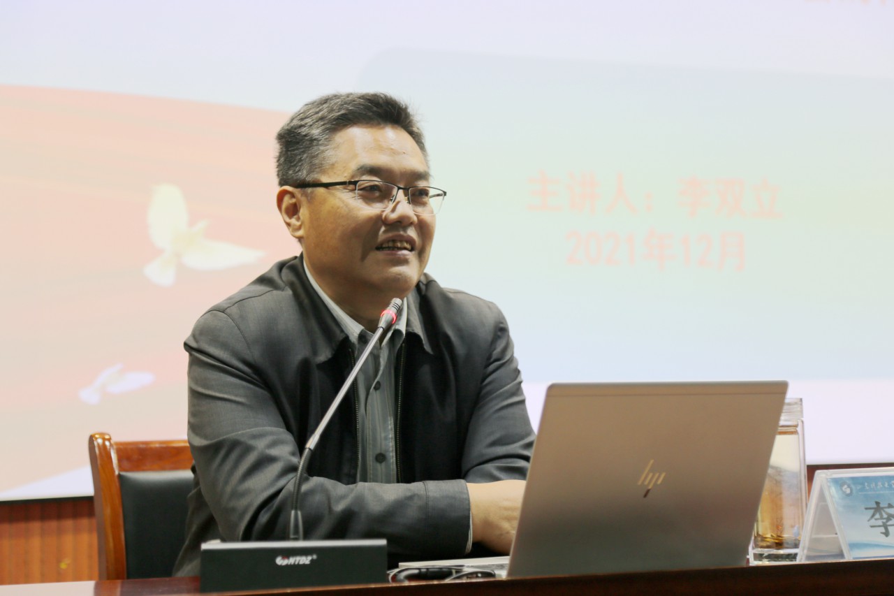 随后,李双立围绕红色精神为学院全体师生讲授了一堂红色思政课。李双立以“以史为鉴,开创未来”为主题,从十九届六中全会概况、重要意义、六大看点以及贯彻落实全会精神四个方面,对全会精神进行了全面准确、深刻透彻的解读。李双立表示,广大党员同志要提高政治站位,充分认识“红色云展厅”进校园的重要意义,深刻把握使命任务,切实把全会精神学习贯彻落实好,确保全会精神落地生根、开花结果。