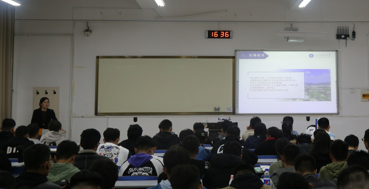 点击:10月27日下午,机电学院在J14-205举办学生干部培训班第四期讲座。学生工作部教育管理科科长李莉老师应邀担任主讲人,机电学院辅导员杨治宽老师出席培训并主持,各年级团支书、班长、副班长及学习委员参加了此次培训。 培训过程中,李莉围绕学校的规章制度向同学进行讲解,根据各种奖惩规则重点解释了部分重要的校规校纪,就班级评优与奖学金评定阐述了违反校纪校规对大学生活与学习的影响,通过讲述了多个生动形象且具有说服力的实例,使得同学们充分认识到遵纪守法的重要性和必要性,为日后成为一名德智体美劳全面发展的文明大学生打下坚实基础。 课程中,同学们用心倾听,积极互动,在轻松愉快的氛围中接受校规校纪教育。此次活动提高了学生干部对校纪校规的认识,进一步开拓工作创新性思维。(通讯员:廖思懿 摄影:殷允浩)