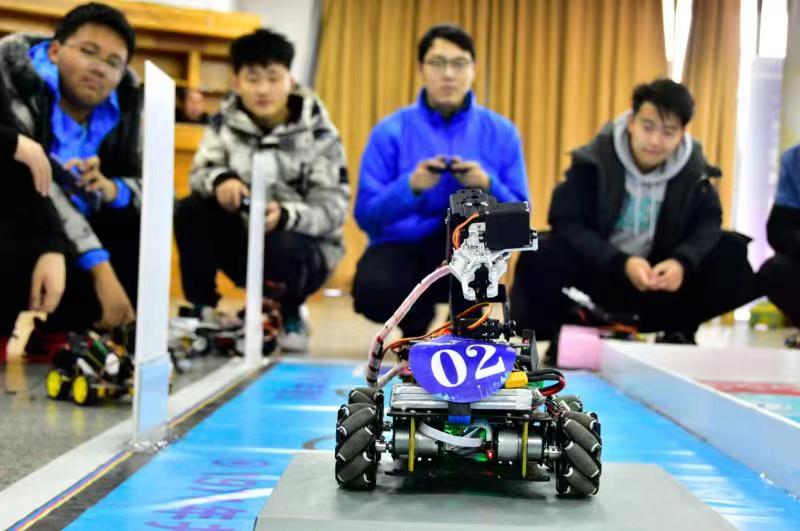 比赛采用机器人循迹越障取物与学校历史发展节点相结合的方式,参赛选手控制机器人的行进路线并越过障碍物,从“初创基业”(启动区)出发,依次经过“风雨兼程”(丛林区)、“改革发展”(桥梁区)、“开拓前进”(迷宫区),象征beat365官网在发展过程中历经多次重大历史事件的考验与艰难曲折的洗礼,合舟共济、奋发有为,各项工作取得成就,最终到达终点“喜迎70华诞”,选手操纵机器人将“机关钥匙”搬运至终点进行堆叠,表达山科学子勤学笃行、以优异成绩回报母校的拳拳之心,最终堆叠误差小、用时少的选手胜出。