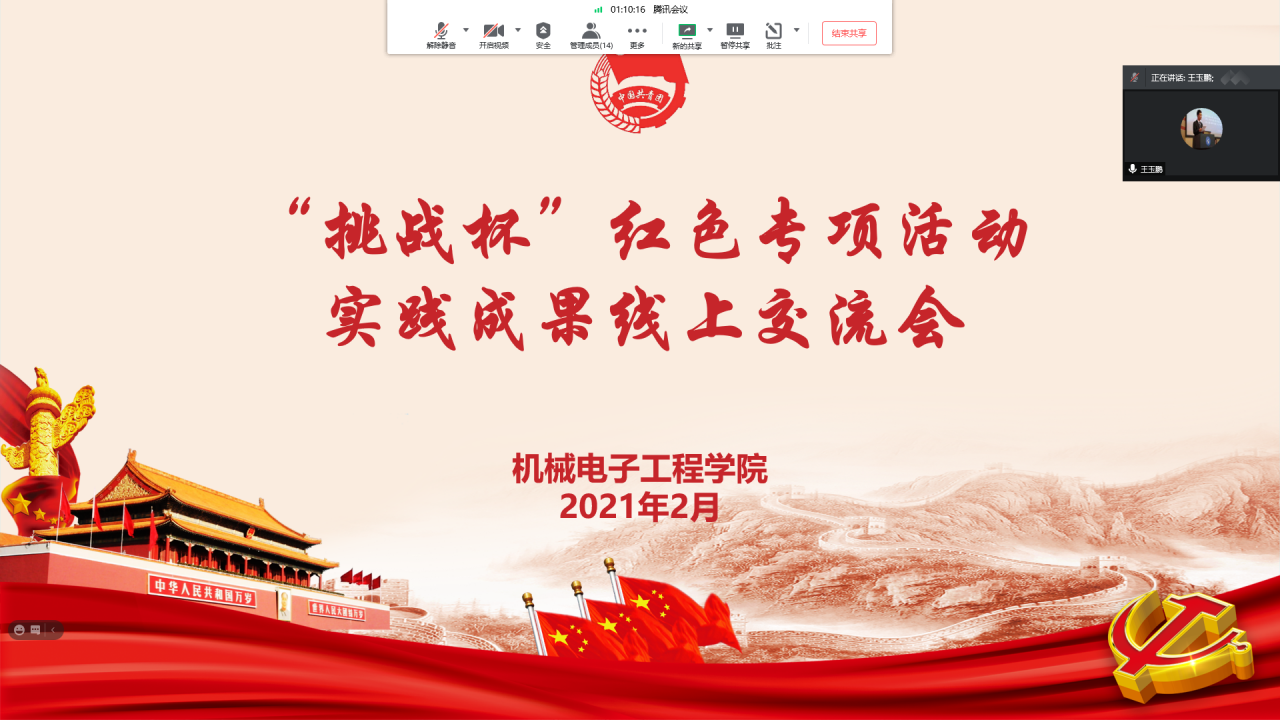 点击:为进一步做好“挑战杯”红色专项活动的备赛工作,提高实践作品质量,扩大实践育人效果。2月22日,机电学院举办了“挑战杯”红色专项活动实践成果线上交流会,机电学院团委老师王玉鹏、苗成旭出席会议,各社会实践项目负责人及志愿实践中心全体成员参加本次会议。