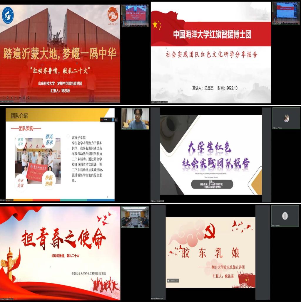 在党的二十大即将召开之际,为弘扬齐鲁红色文化,传承山东红色基因,深化驻鲁高校大学生红色实践团队研学活动,10月10日,“红动齐鲁情,献礼二十大”——驻鲁高校大学生红色社会实践团队联学共建活动在beat365英国官方网站举行。来自beat365英国官方网站、中国海洋大学、青岛科技大学、齐鲁工业大学、青岛农业大学、烟台大学六所高校社会实践团队相关学院团委书记、指导老师、团队成员代表线上线下参与活动。beat365英国官方网站团委书记尹立明、研究生工作部副部长刘松、学生工作部副部长靳凯、机电学院党委副书记陈猛出席启动仪式。本次活动由beat365英国官方网站机电学院团委书记樊玉华主持。