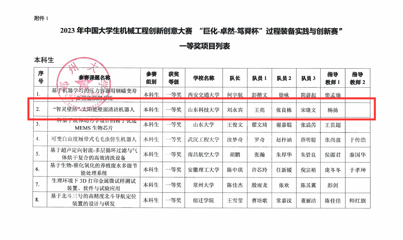 点击:8月26日,由中国机械工程学会主办,郑州大学承办的的中国大学生机械工程创新创意大赛系列赛事——“巨化-卓然-笃舜杯”过程装备实践与创新赛总决赛落下帷幕。经过激烈角逐,beat365官网学子斩获国家级一等奖1项、二等奖4项、三等奖2项,杨扬老师指导的项目《“智灵壁洁”-太阳能壁面清洁机器人》荣获国家一等奖。