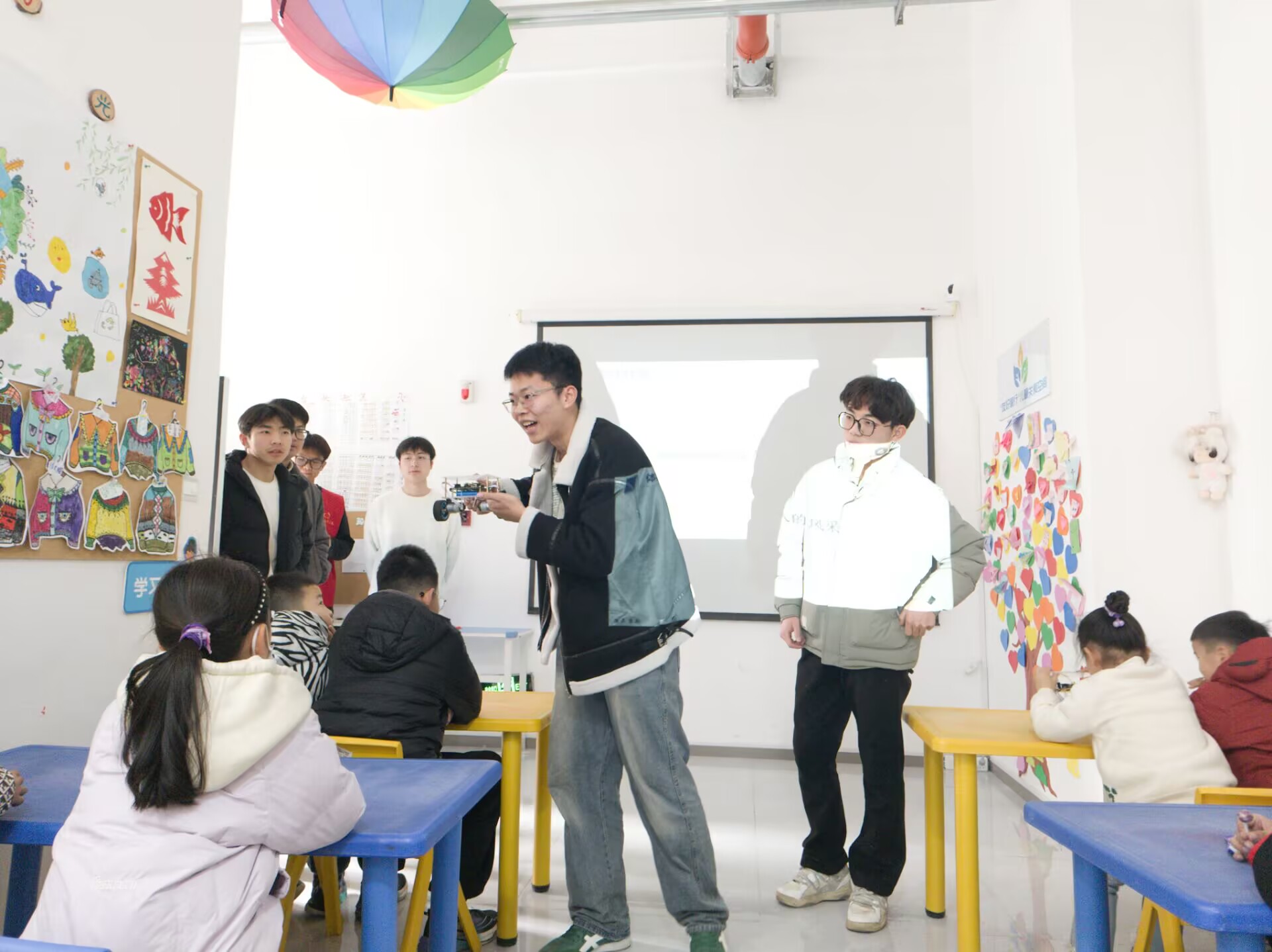 活动开始,志愿者们以一段精彩的机器人发展历程视频作为开场,从早期简单的机械装置到如今功能强大的智能机器人,小朋友们被屏幕上不断变化的画面深深吸引。紧接着,志愿者借助精心制作的模型与通俗易懂的动画,深入剖析机器人的基本构造,详细介绍从核心芯片到灵活机械臂,各个部件如何协同运作。讲解过程中设置问答环节,小朋友们积极参与,志愿者们为每一位积极回答的小朋友送上精心准备的3D打印小玩具。