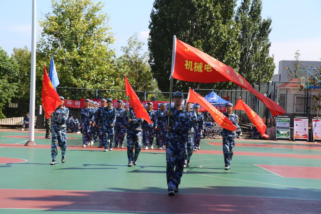 分列式训练以“齐步变正步”为核心,注重动作规范与团队协作。机电学院的学子们在教官指导下反复打磨摆臂高度、步伐间距,烈日下汗水浸透衣衫,却无人松懈。每一次踢腿定型、摆臂发力,都凝聚着对“整齐划一”的极致追求。学院方队则通过“分解练习+整体合练”模式,从单列行进到多列协同,逐步提升排面整齐度。教官强调:“正步的‘秒米不差’不仅考验个人素质,更需集体默契。”