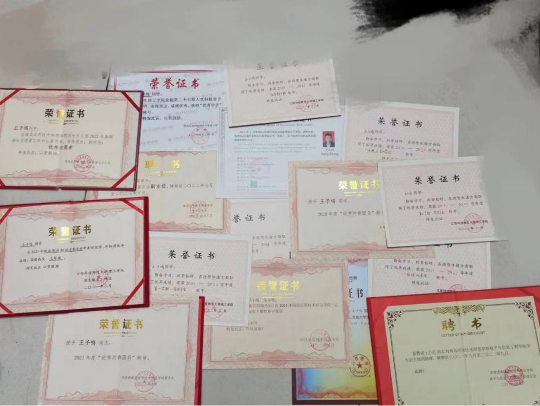 专业学习中,除课程内容知识,还系统学习其他计算机专业相关知识。多次参加江西省信息技术大赛,荣获一次一等奖,三次二等奖,荣获Web前端开发职业技能等级证书(中级),参加计算机软件等级考试、新华三认证(H3CNE)、全国大学生广告艺术大赛,曾参加全国大学生创新创业大赛作品省级立项重点项目,并注册"南昌市易致同路人空间技术应用有限责任公司"。