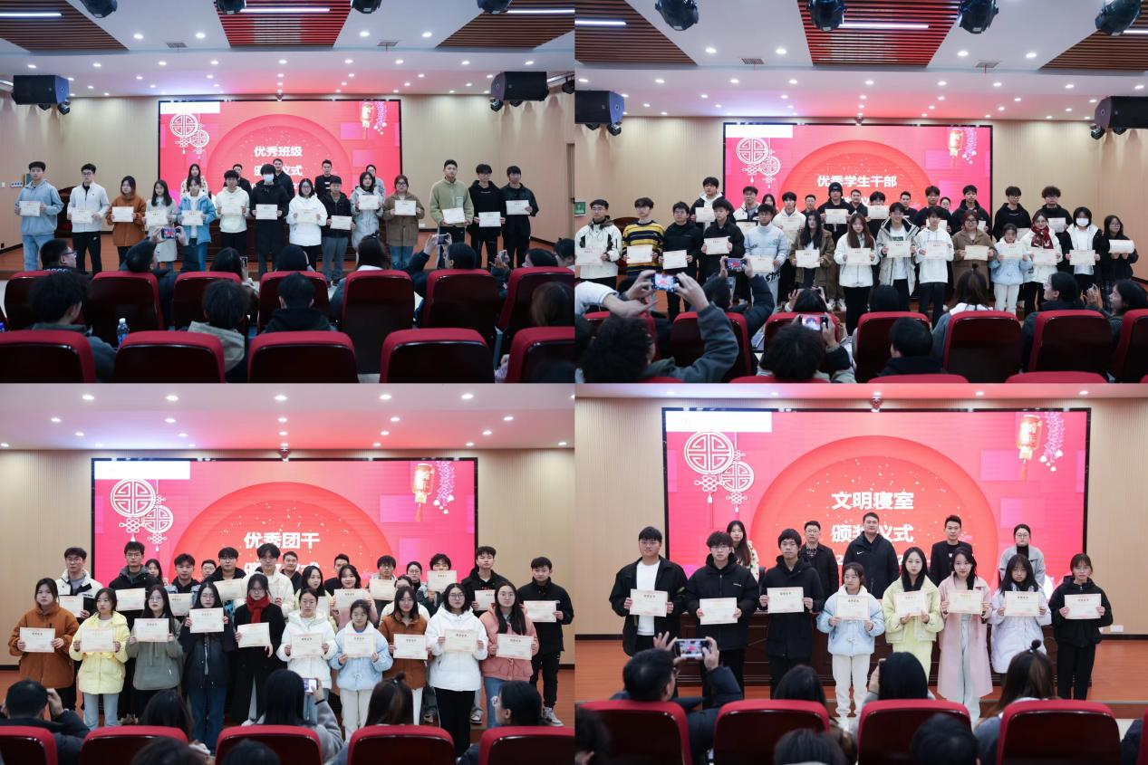 表彰大会在庄严的国歌声中拉开序幕。会议颁奖环节分别由党总支书记江建华宣读优秀班级名单并颁奖;党总支副书记黄金标宣读优秀学生干部名单并颁奖;副院长刘军宣读优秀团干名单并颁奖;学生管理科科长肖诗婷宣读优秀表演人员名单并颁奖;组织员程明珠宣读文明寝室名单并颁奖。同时,院领导与获奖学生合影留念,现场观众热情祝贺。