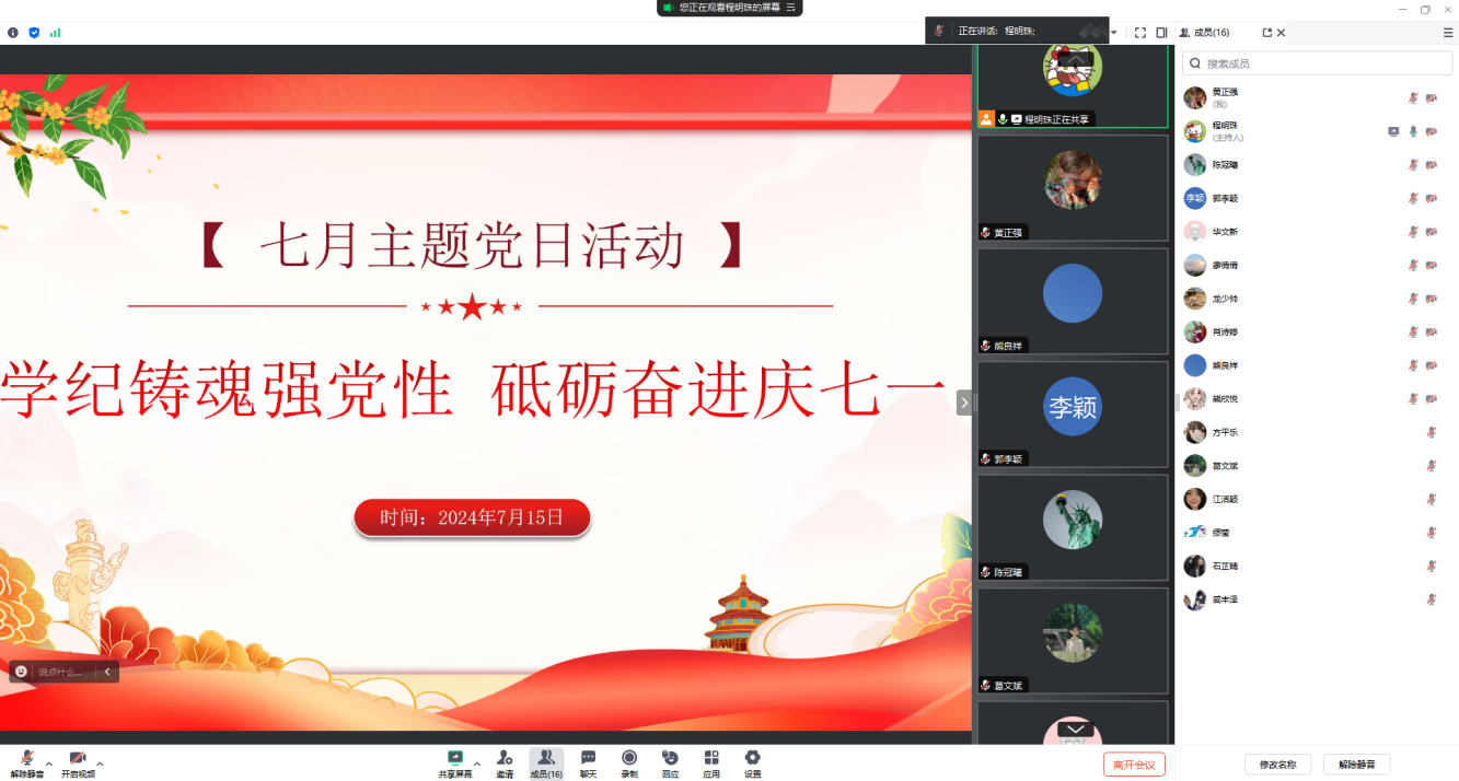 为庆祝中国共产党成立103周年,弘扬伟大建党精神,贯彻落实新时代党的建设总要求,进一步健全全面从严治党体系推动党纪学习教育走深走实,pa电子官方网站第二党支部于7月15日召开线上会议,开展了“学纪铸魂强党性 砥砺奋进庆七一”主题党日活动。
