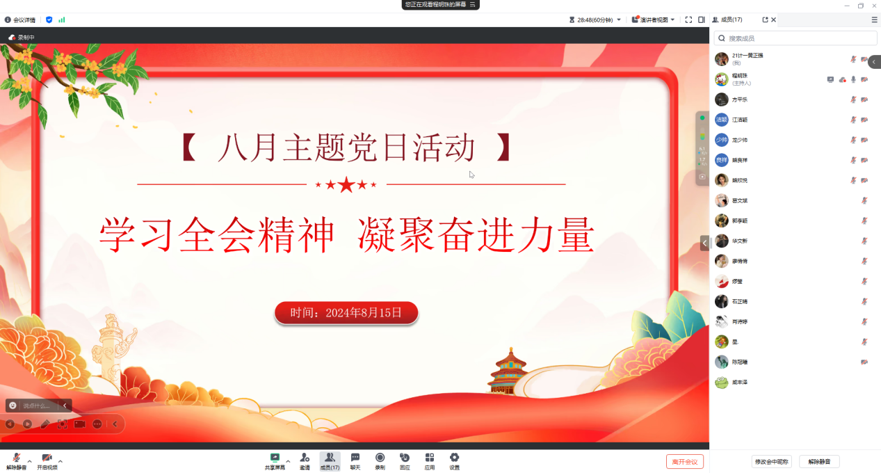 为深入学习贯彻党的二十届三中全会精神,感悟革命历史,强化爱国情怀和使命感,激励党员同志勇毅前行,争当先锋,pa电子官方网站第二党支部于8月15日召开线上会议,开展了“学习全会精神 凝聚奋进力量”主题党日活动。
