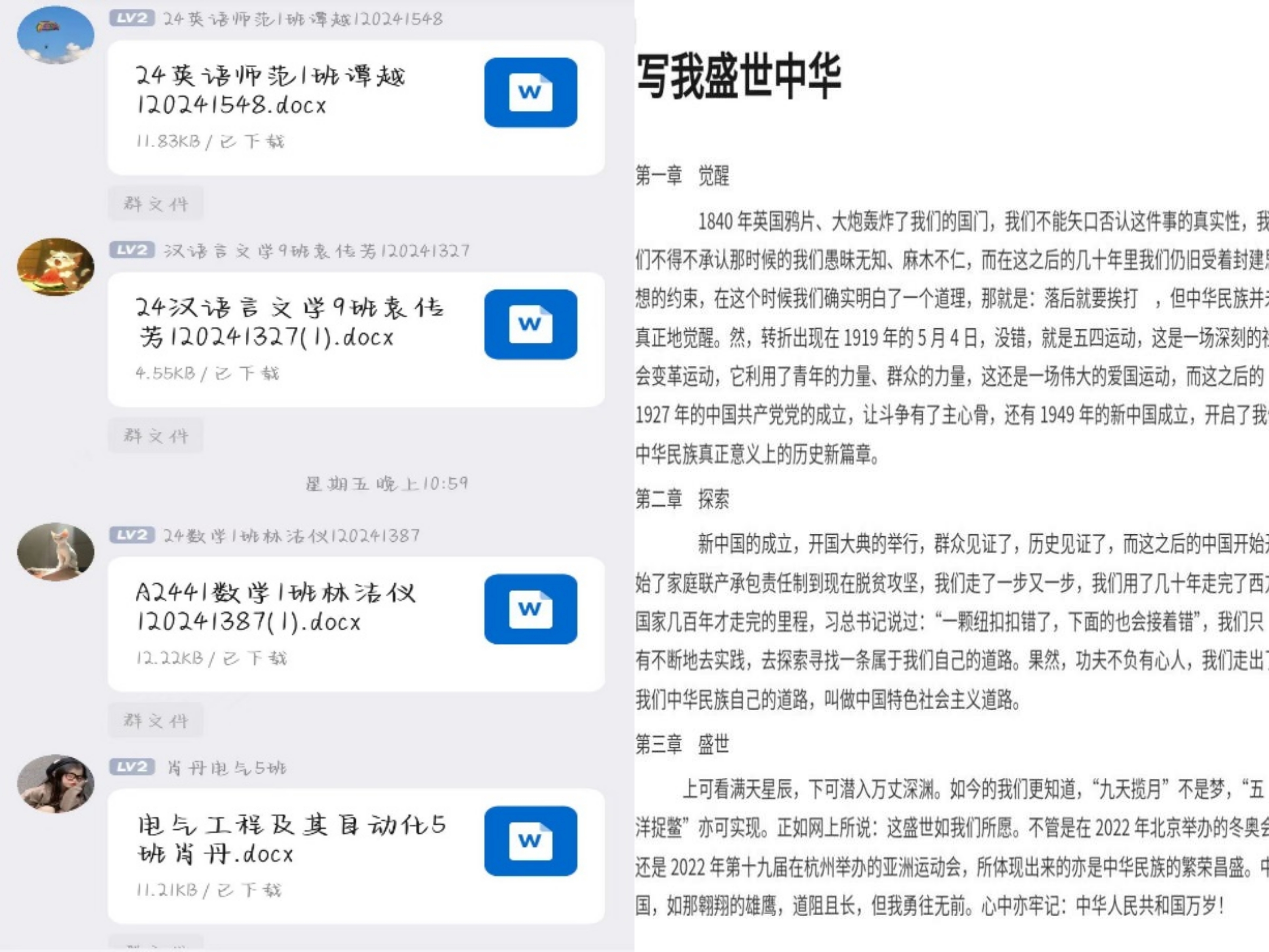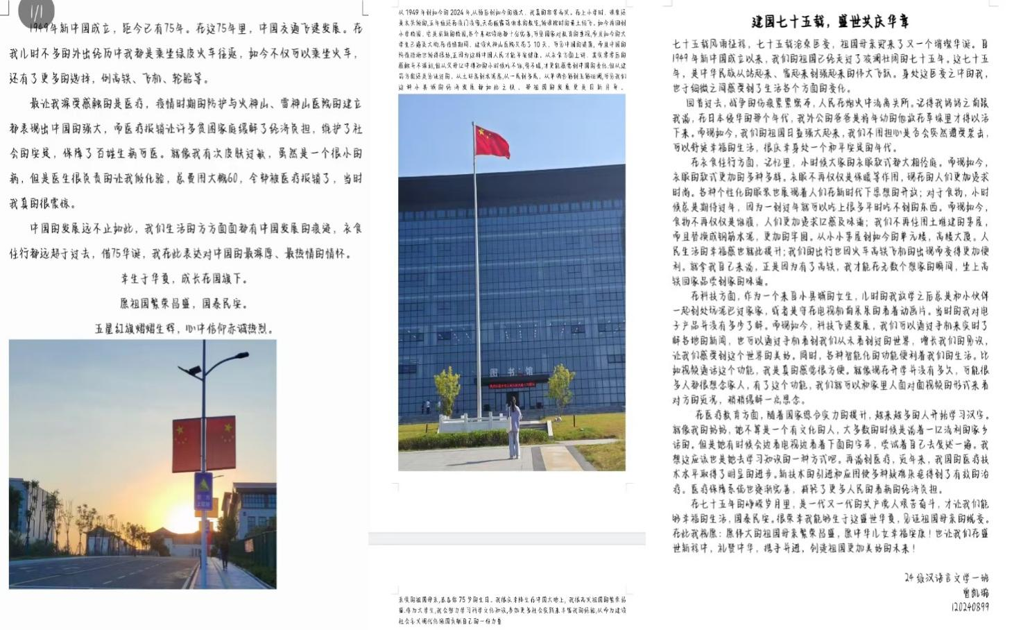 此次活动我们充分利用网络平台,以创新的形式激发应师青年们的爱国热情。从活动群的创建开始,后面几天都不断有同学进群并以文档的形式将自己所写的文章发在群内,虽然期间也有很多参与人员对于活动的主题和要求不是很清楚,但我们的活动负责人及时发好公告并耐心的逐一回复参与者有关活动的疑问和不解,让参与人员有更好的活动体验感。文档提交完毕后,工作人员从中挑取了十篇相对精美的文章作为优秀奖,一篇篇饱含深情的文章,如《写我盛世中华》《祝中华人民共和国成立75周年快乐》《丹桂飘香迎国庆,日新月异华夏兴》等,都充分表达出了同学们对祖国的深情赞美和无限热爱。