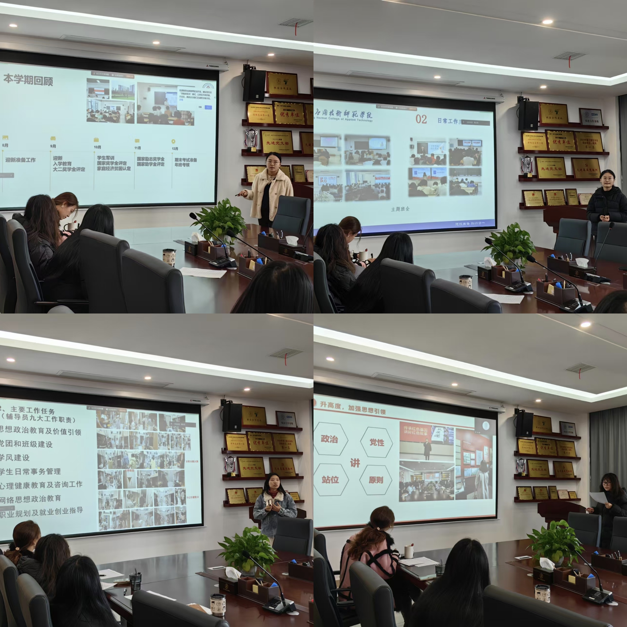 会议伊始,学院党政人员认真地汇报了2024年来取得的工作成绩(标志性成果)和工作亮点,认真分析出现的问题并汇报下一步工作措施。各辅导员以PPT形式从党团建设、学生日常管理、班风学风建设、安全与心理建设及就业指导等多方面述评自己一年来的工作举措及取得成果。在汇报过程中,大家以照片形式展示了与学生互动的精彩瞬间,充分体现了辅导员们深入学生生活,有爱心、会工作、肯奉献的精神。