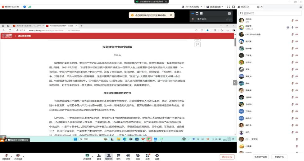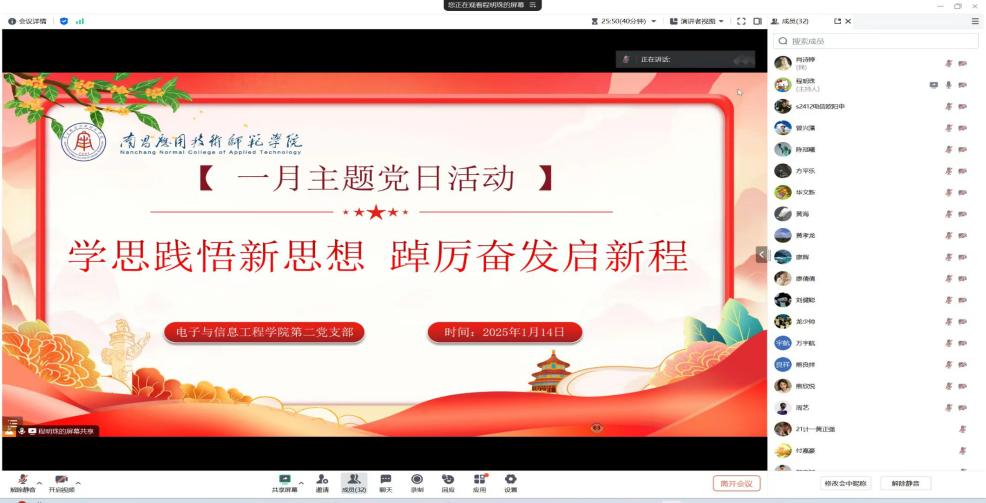 为持续深入学习贯彻习近平新时代中国特色社会主义思想,弘扬伟大建党精神,使全体党员更加自觉地学习党章、遵守党章、贯彻党章、维护党章,pa电子官方网站第二党支部于2025年1月14日,在腾讯会议组织召开了“学思践悟新思想 踔厉奋发启新程”主题党日活动。支部全体党员参加了此次会议,会议由党支部书记程明珠主持。
