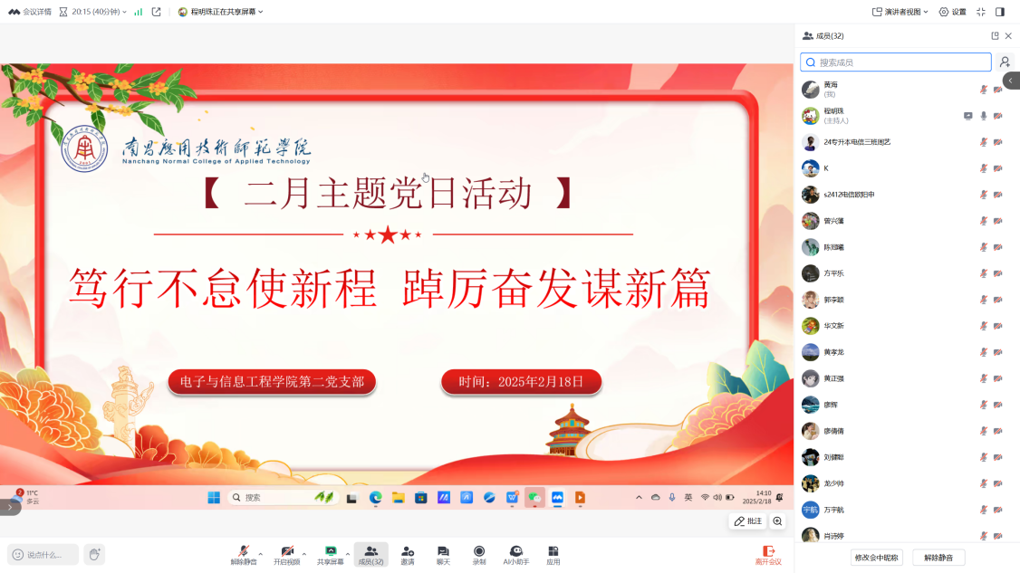 为深入学习习近平新时代中国特色社会主义思想和习近平总书记重要讲话精神,激励党员始终以榜样为标杆,提升服务意识,发挥先锋模范作用,pa电子官方网站第二党支部于2月18日在腾讯会议组织开展“笃行不怠使新程,踔厉奋发谱新篇”主题党日活动。