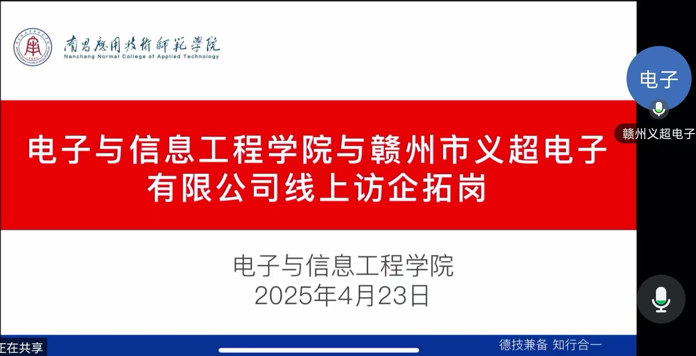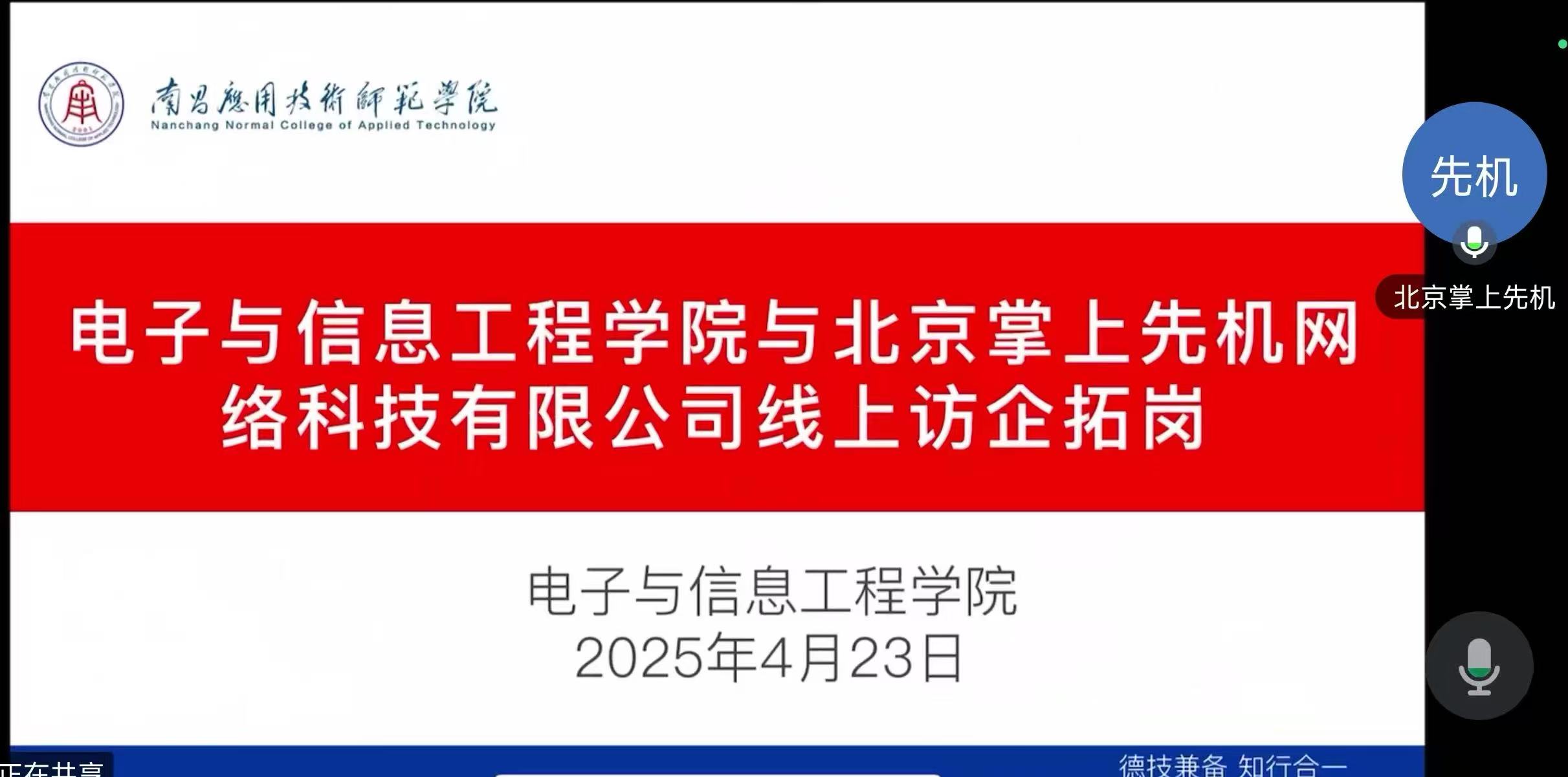 为贯彻落实党中央、国务院关于“稳就业”、“促就业”工作部署,按照教育部、省教育厅关于“访企拓岗”促就业专项行动工作要求,深入了解企业需求、挖掘实习就业岗位,全力促进毕业生更高质量就业,pa电子官方网站积极开展访企拓岗专项行动,院长魏艳平于4月23日通过线上视频会议与北京掌上先机网络科技有限公司、赣州市义超电子有限公司、江西引力节拍文化传媒有限公司、浙江京鸿供应链管理有限公司进行洽谈。