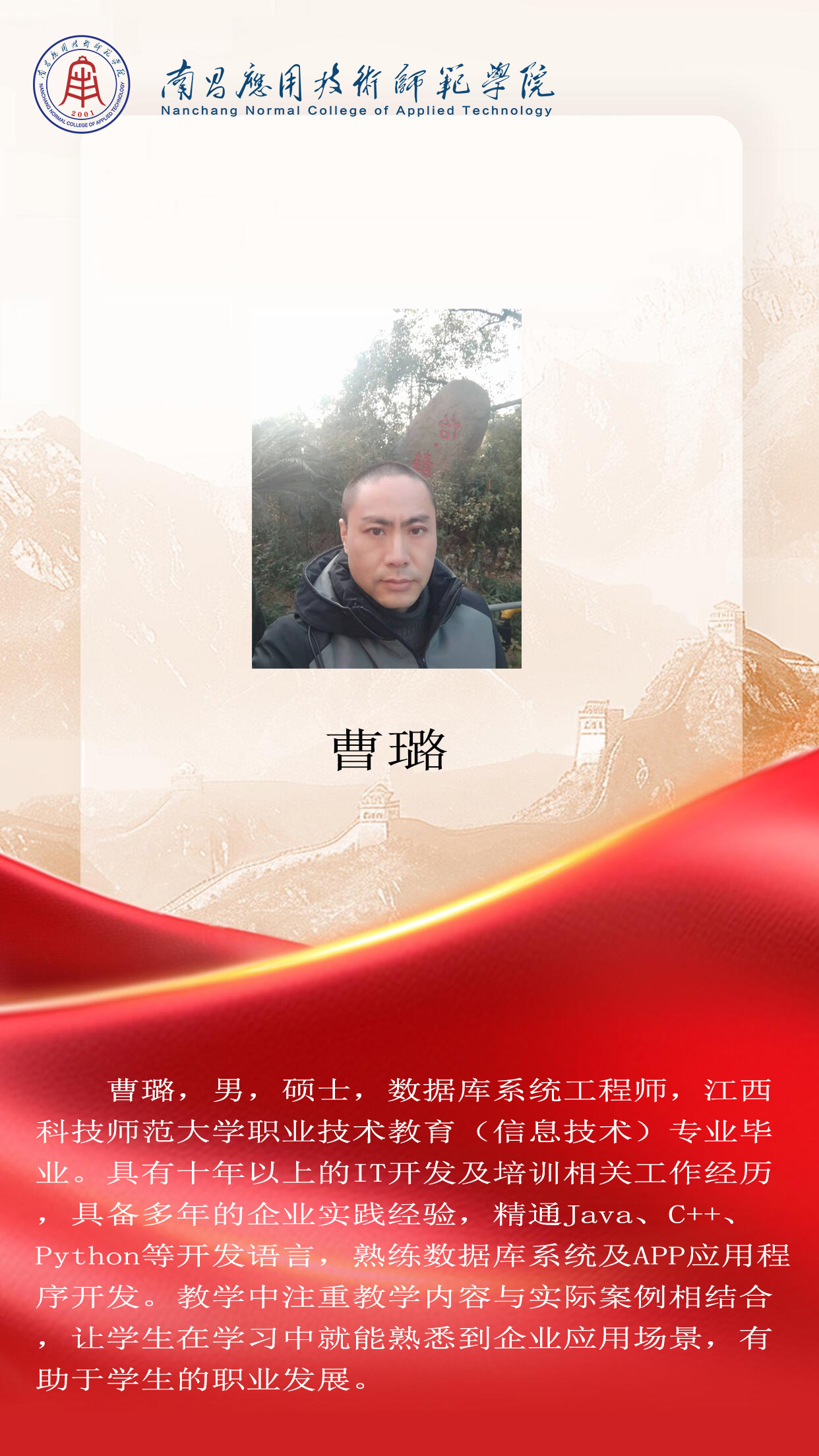 先进典型 优秀毕业生 优秀学生风采 优秀教职工 您现在的位置是:首页 > 先进典型 > 优秀教职工 曹璐 计算机系主任 管理员2025-06-161207 上一篇 曹海 副教授 下一篇 张扬 工程技术系主任