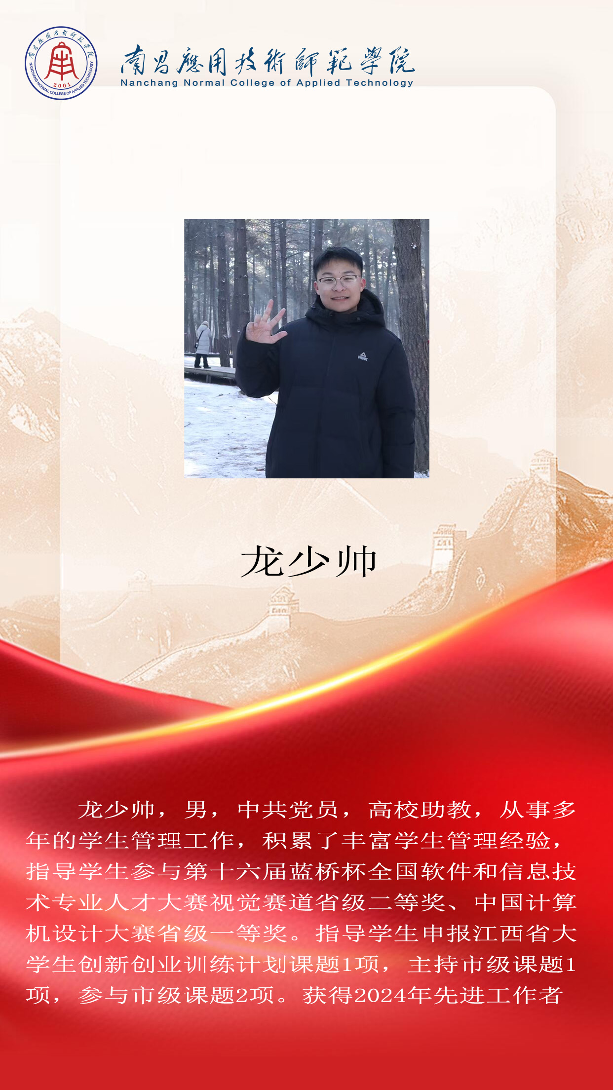 先进典型 优秀毕业生 优秀学生风采 优秀教职工 您现在的位置是:首页 > 先进典型 > 优秀教职工 龙少帅 先进工作者 管理员2025-06-161245 上一篇 刘硕 数字媒体系主任 下一篇 张扬 工程技术系主任