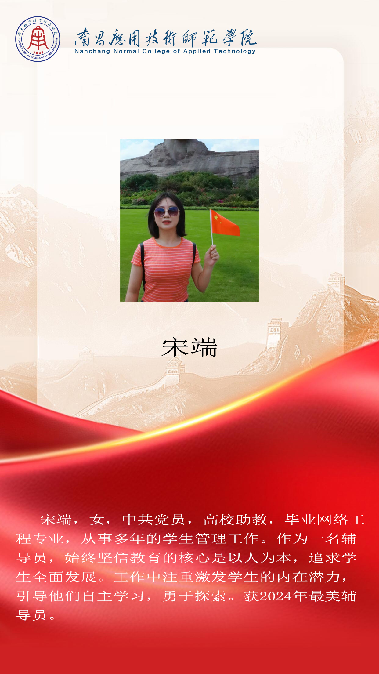 先进典型 优秀毕业生 优秀学生风采 优秀教职工 您现在的位置是:首页 > 先进典型 > 优秀教职工 宋端 最美辅导员 管理员2025-06-161220 上一篇 龙少帅 先进工作者 下一篇 张扬 工程技术系主任