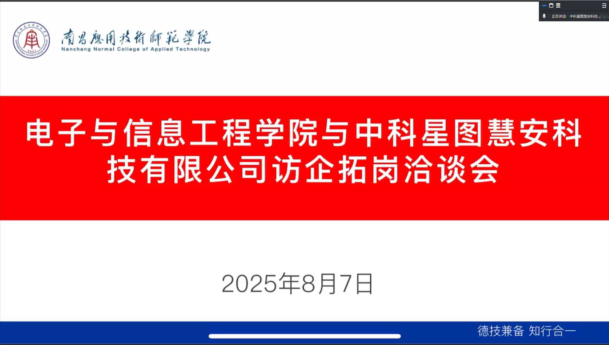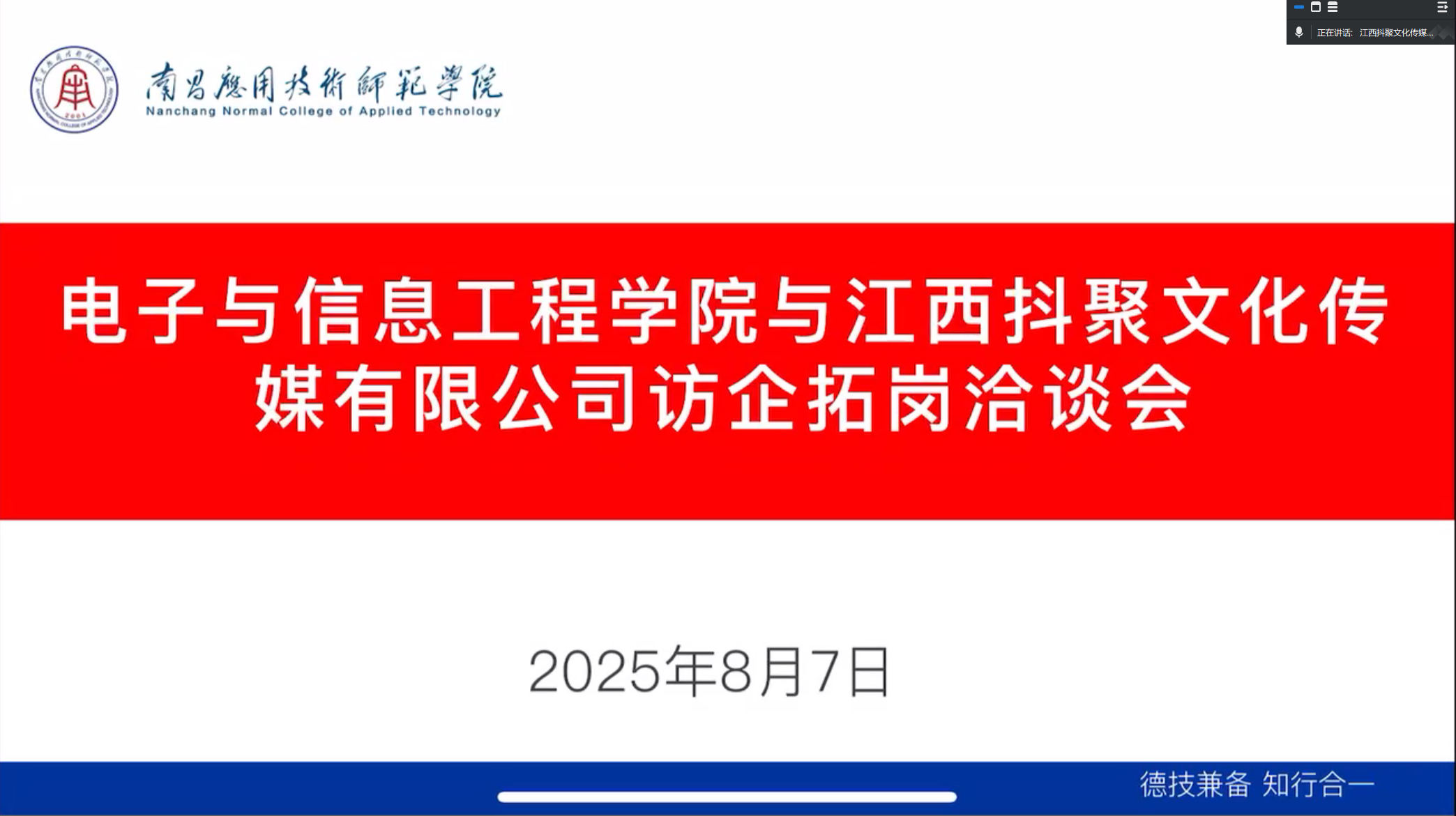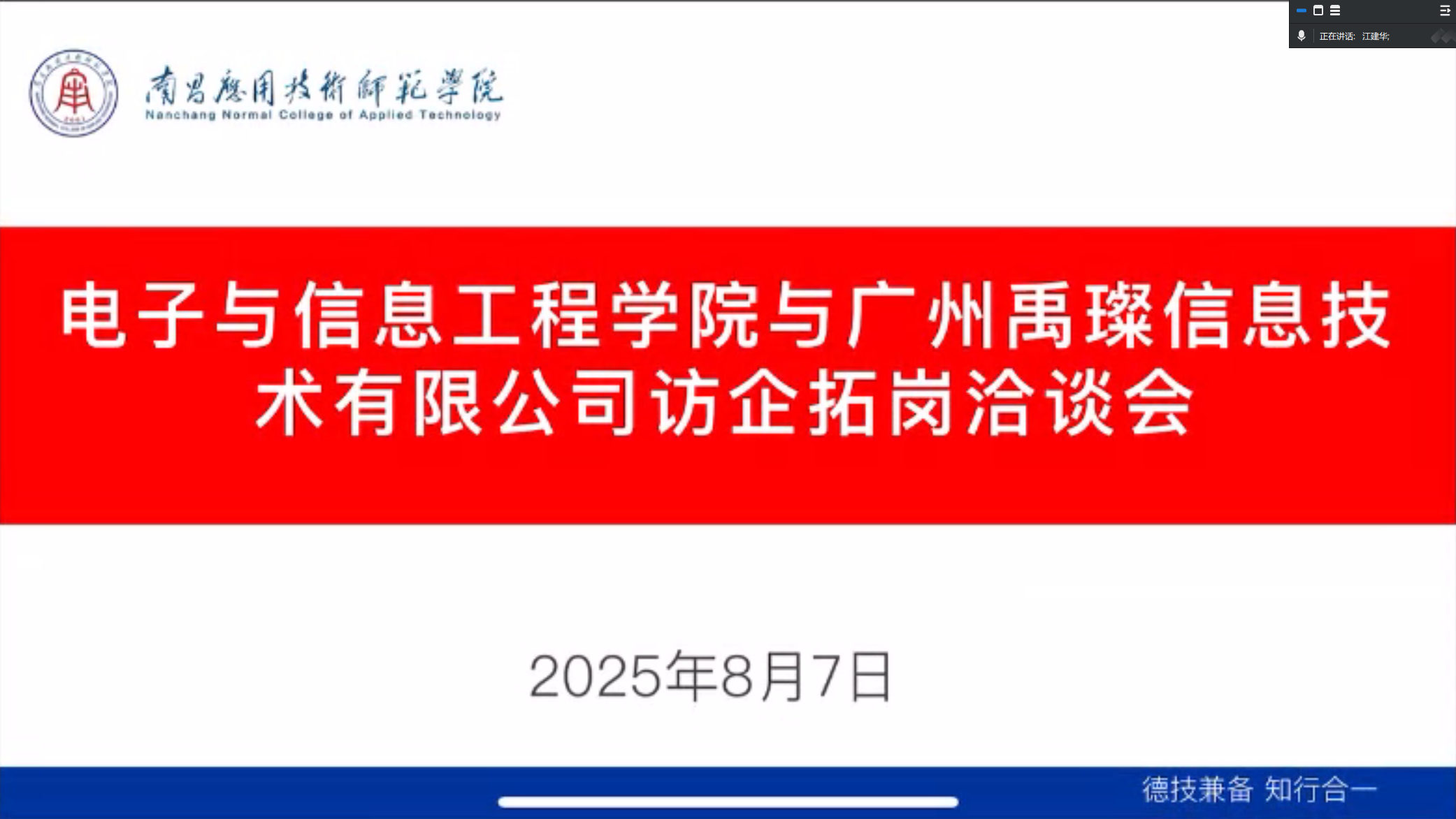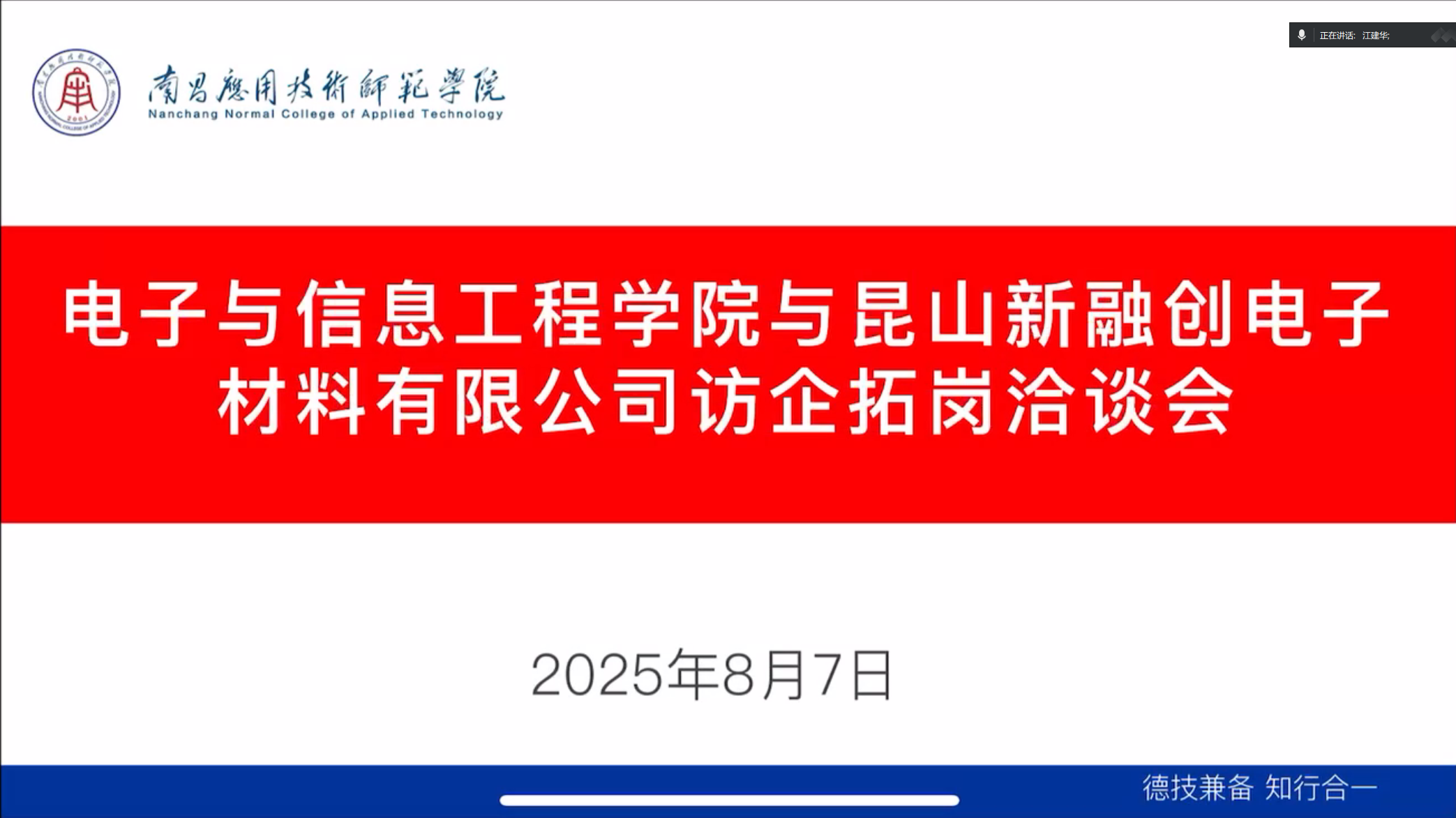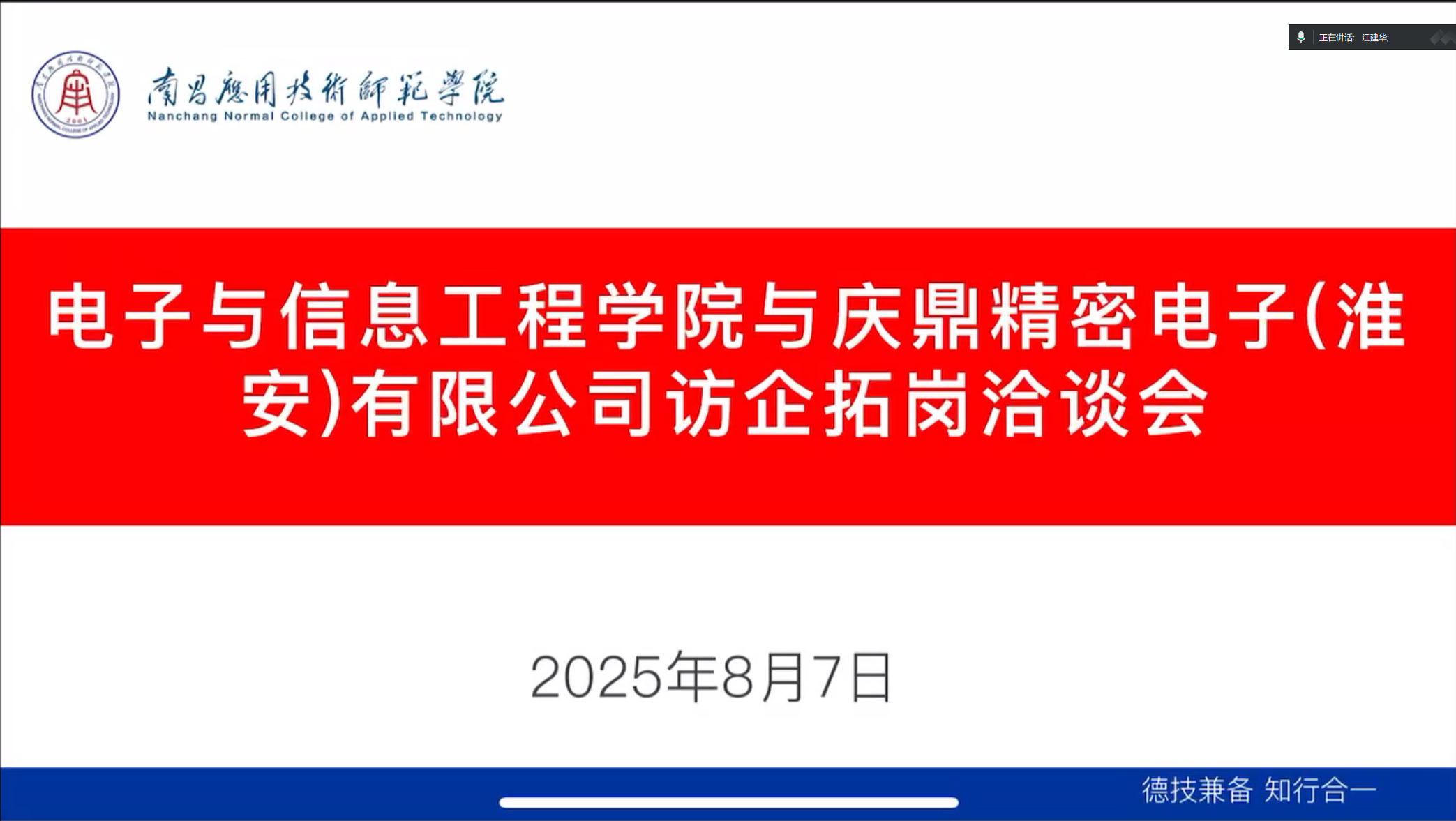 为进一步加强校企合作,做好供需精准对接,拓宽应届生就业渠道。近日,电子与信息工程学院党总支书记江建华在腾讯会议与庆鼎精密电子(淮安)有限公司、昆山新融创电子材料有限公司、江西抖聚文化传媒有限公司、中科星图慧安科技有限公司、广州禹璨信息技术有限公司开展线上访企拓岗座谈会。