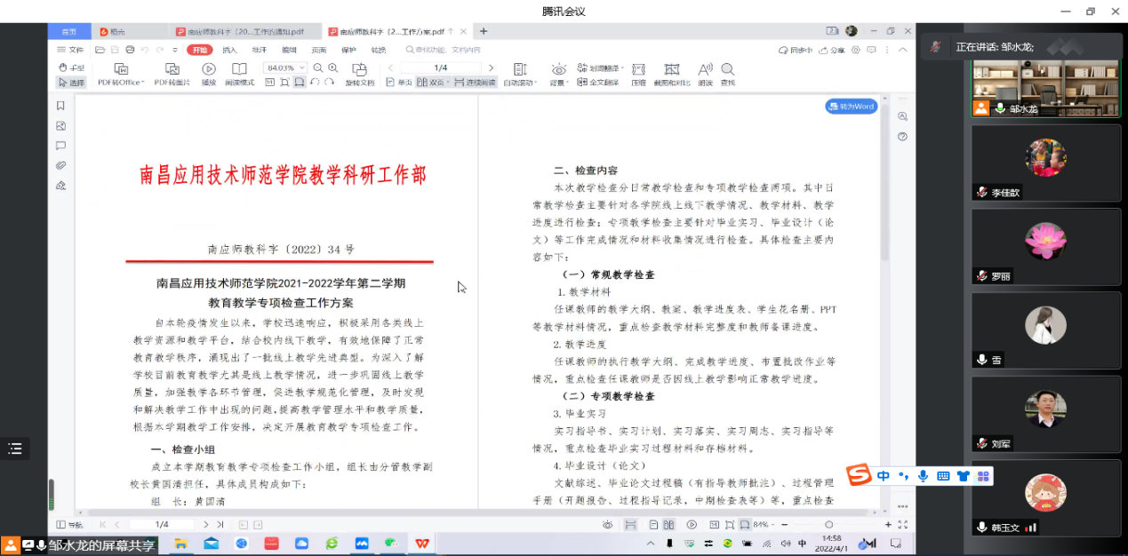 4月1日,pa电子官方网站利用腾讯会议,线上召开教研室工作会,教务管理人员、教研室主任参加了此次会议,会议由院长邹水龙主持。