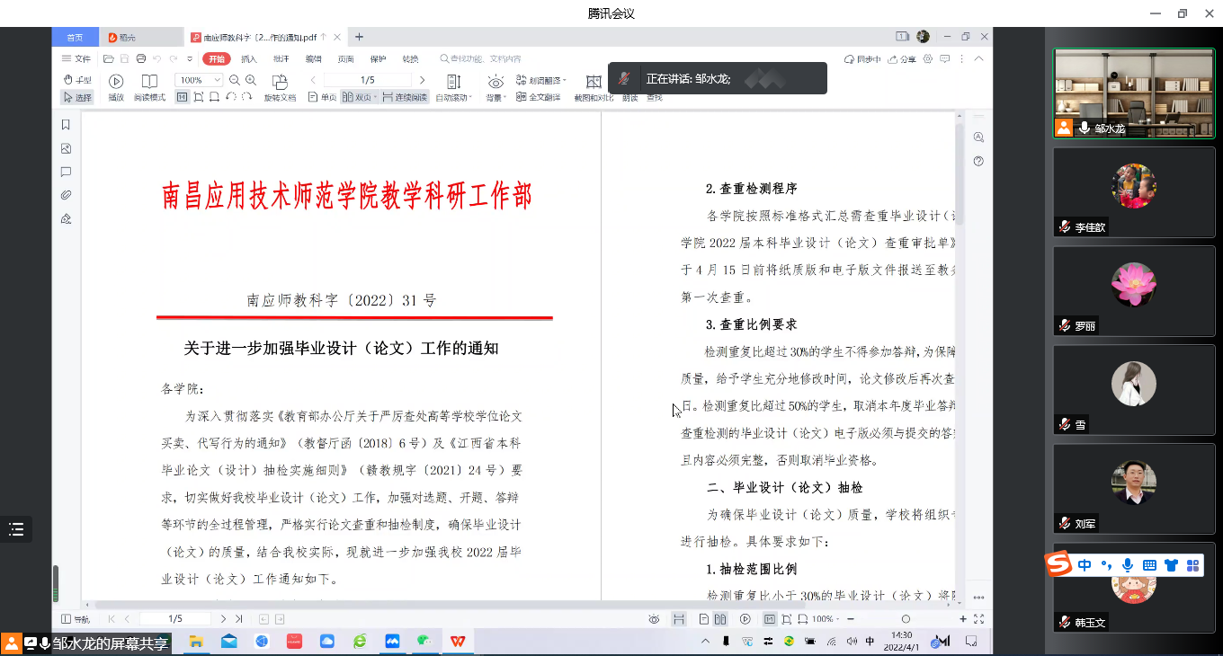 会上,邹水龙全文宣读了“关于进一步加强毕业设计(论文)工作的通知”(南应师教科字[2021]31号)、“pa电子官方网站2021-2022学年第二学期教育教学专项检查工作方案”(南应师教科字〔2022〕34 号)等文件,对毕业设计(论文)各个环节的工作进行了重点解读,邹水龙强调,毕业设计(论文)是人才培养重要环节,各教研室主任要提高认识,严格按照教育部、教育厅和学校相关文件要求,加强过程管理,加强督促,确保毕业生毕业设计(论文)质量。随后,与会老师围绕毕业设计(论文)指导、查重、答辩以及教育教学检查等方面工作进行了详细讨论。
