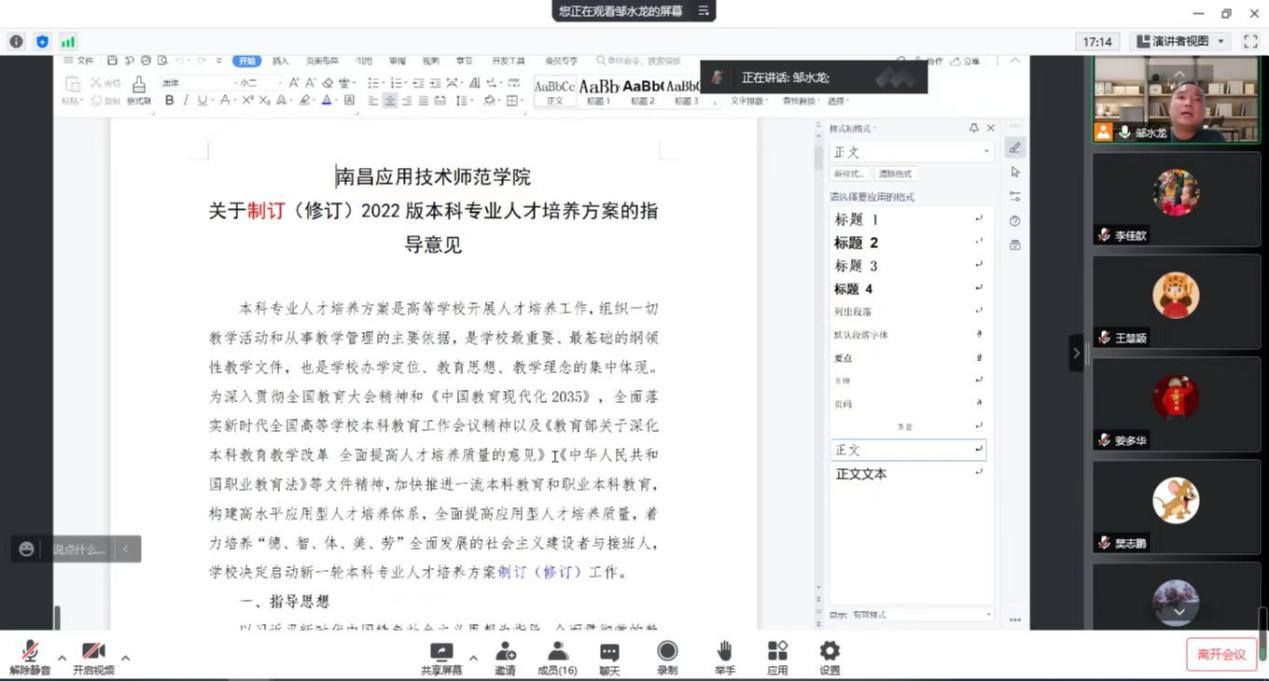 为扎实做好2022版人才培养方案修(制)订工作,5月15日晚,pa电子官方网站利用腾讯会议,线上召开2022版人才培养方案修(制订)线上研讨会,学院教学管理人员、全体专任老师参加了此次会议,会议由院长邹水龙主持。