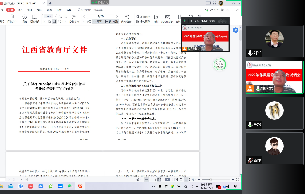 会上,邹水龙传达了学校对职业本科专业申报工作的总体要求,并带领大家认真学习江西省教育厅下发的《关于做好2022年江西省职业教育拟招生专业设置管理工作的通知》。邹水龙强调,职业本科专业申报专业性强、要求高,各专业负责人务必加强调研,专业论证报告要充分、支撑性材料要详实,确保申报材料质量。